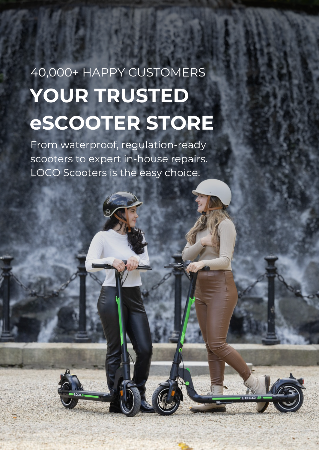 Discover our range of top brands, including LOCO, KuKirin, Segway, Dualtron, VSETT, and more. Our UK store offers an extensive selection of electric scooters, all supported by our in-house warranty and repair centre. Our electric scooters provide an eco-friendly, cost-effective, and enjoyable way to travel. Shop online or visit us today to find the perfect electric scooter for your needs. Experience the best in electric scooters across the UK with LOCO Scooters!